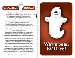 There’s this Halloween tradition in the suburbs called “Boo-ing.” I’ve attached a copy of the note (go to http://www.beenbooed.com) that anonymous revelers leave along with the treats on your front porch, Ding Dong Ditch-style, that pretty much explains it all. I don’t care how it came about; I simply find it awesome that people leave candy for me right on my front porch. I hope that once day the girl scouts will start doing it this way with their cookies. And I wish they would do it during the day instead of at night when all of my pesky kids are around to lay claim to the goodies. But I’m also considering cutting my doorbell wire.