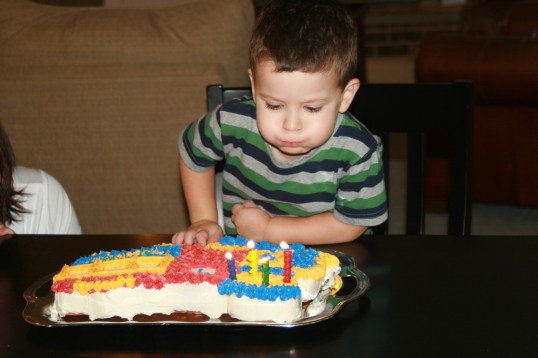 “Happy Birthday” written out by mom. Lego guys (one on a chain), Super Mario character with a broken wing, Double X-eyed guy, blue plastic bear, and a “See No Evil” monkey all added by Kid E.